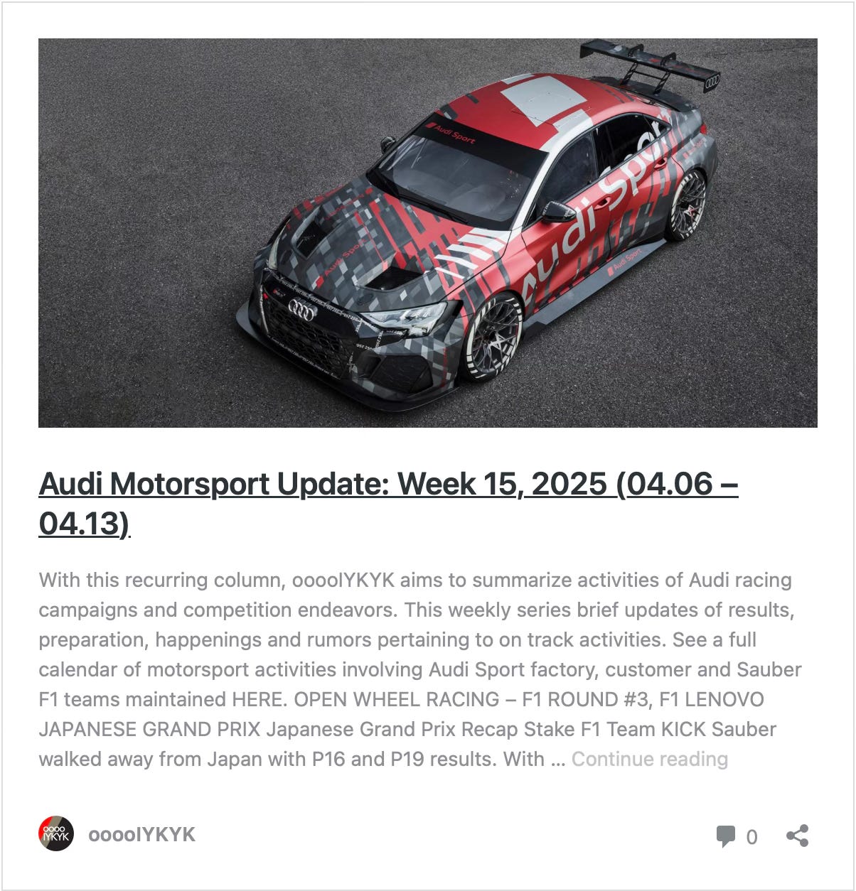 Covering the spread from F1 down to privateer customer racing, these weekly racing rundowns help keep up to date on teams racing around the world. Audi stopped producing their own customer racing updates, so while time consuming, these reports should prove essential for Audi motorsport fans and help keep those watching the lead-up to F1 to also be aware of goings on.